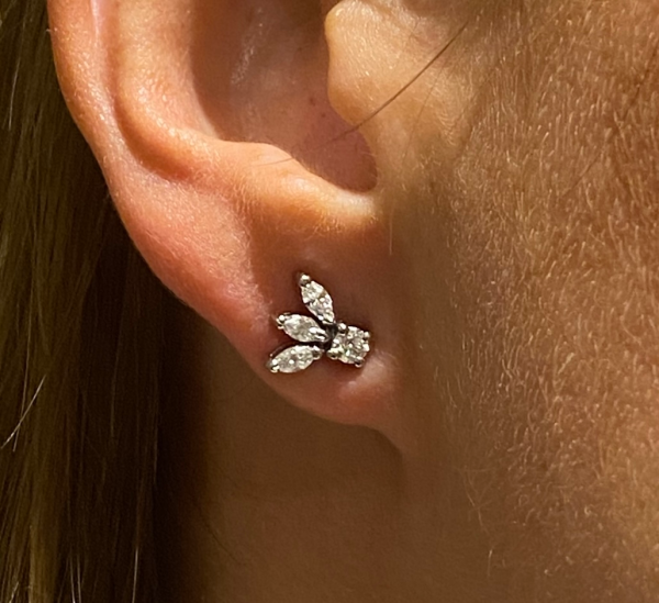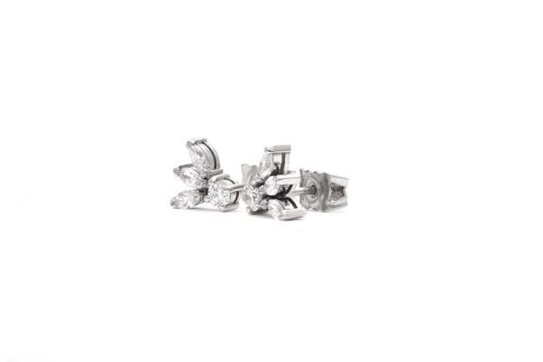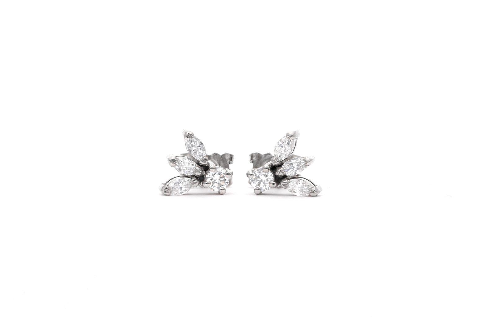 Description: These sparkling beautiful diamond earrings resemble a birds wing, handmade in platinum with 6x natural marquise cut diamond and 2x natural round cut diamonds. A real captivating and uncommon design.