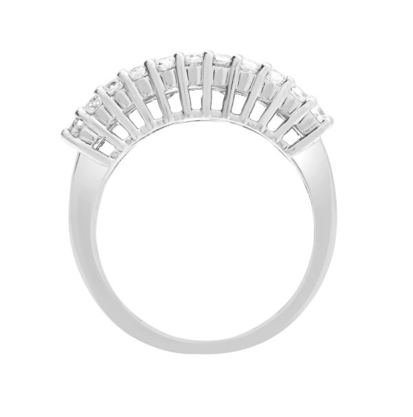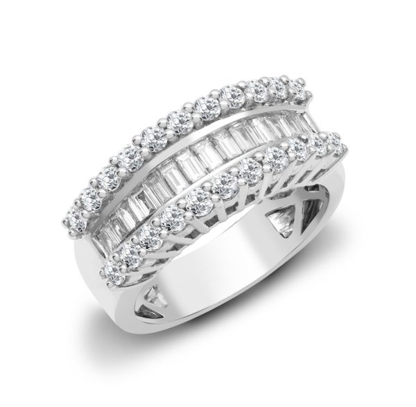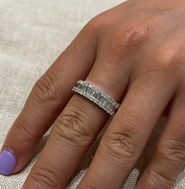 Description: This eye catching half eternity  diamond and 18ct white gold has a round brilliant cut and baguette cut combination. The stunning diamonds are based on a G colour SI1 clarity and the ring is 8mm wide.