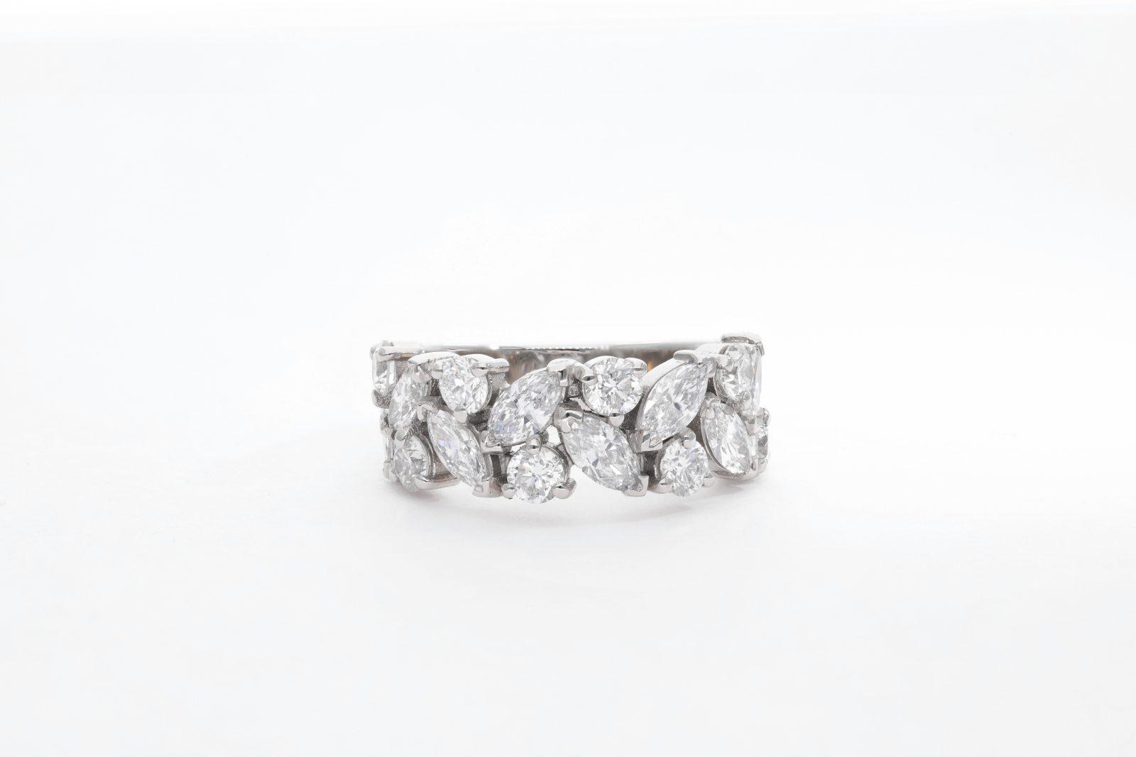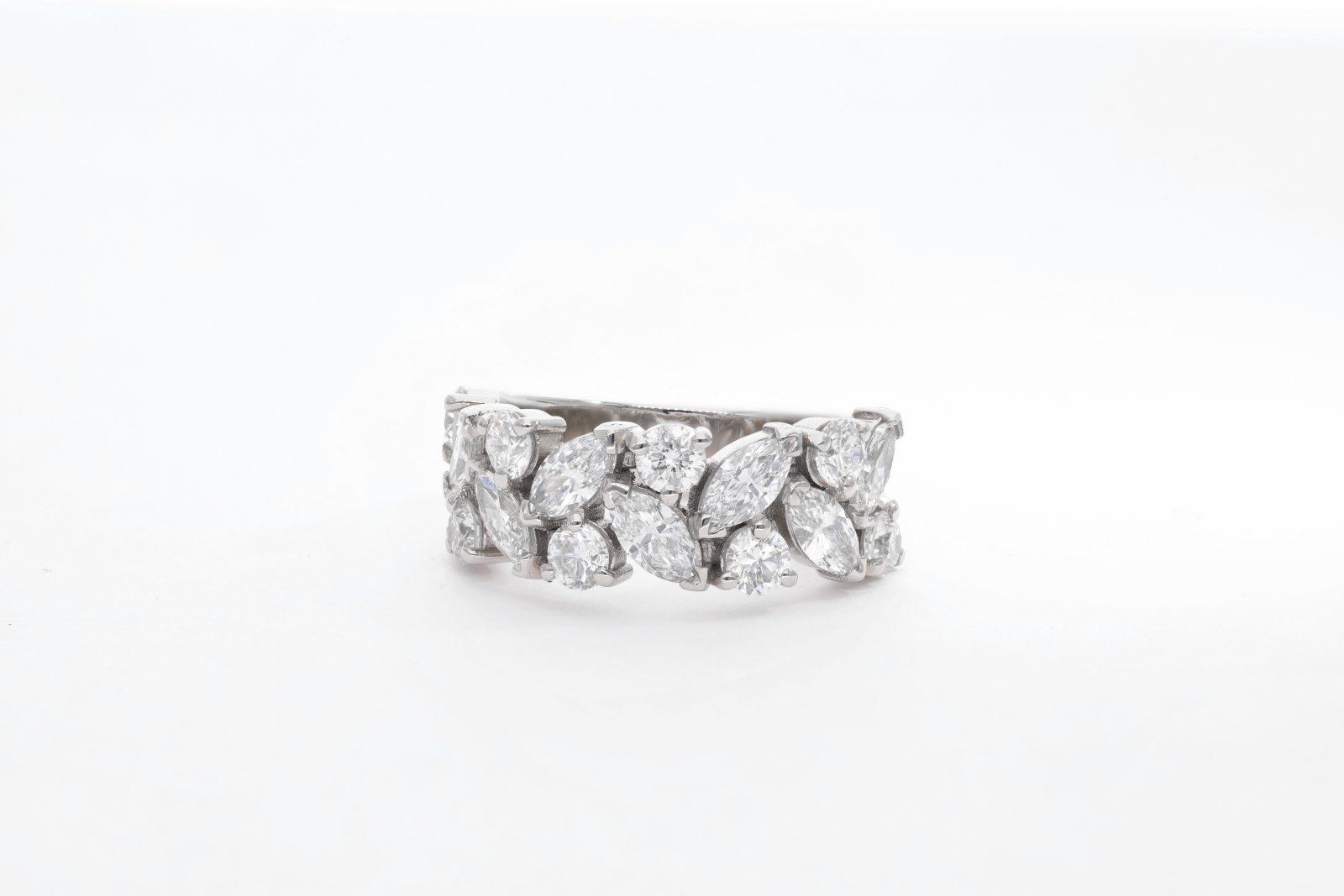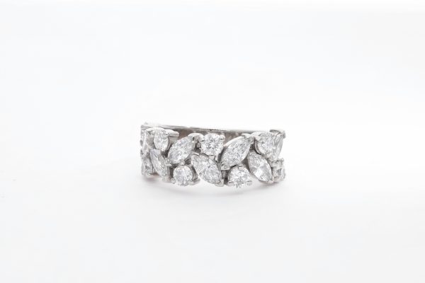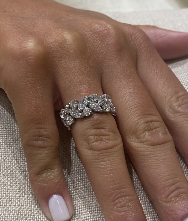 Description: A captivating design. This stunning handmade platinum ring presents a total of 16 labgrown diamonds. Including 8 marquise cuts and 8 round cuts. The beautiful marquise cut stones are set into two ‘v’ claws and the rounds set into 4 rounded claws. All diamonds are based on a G colour and VS clarity.